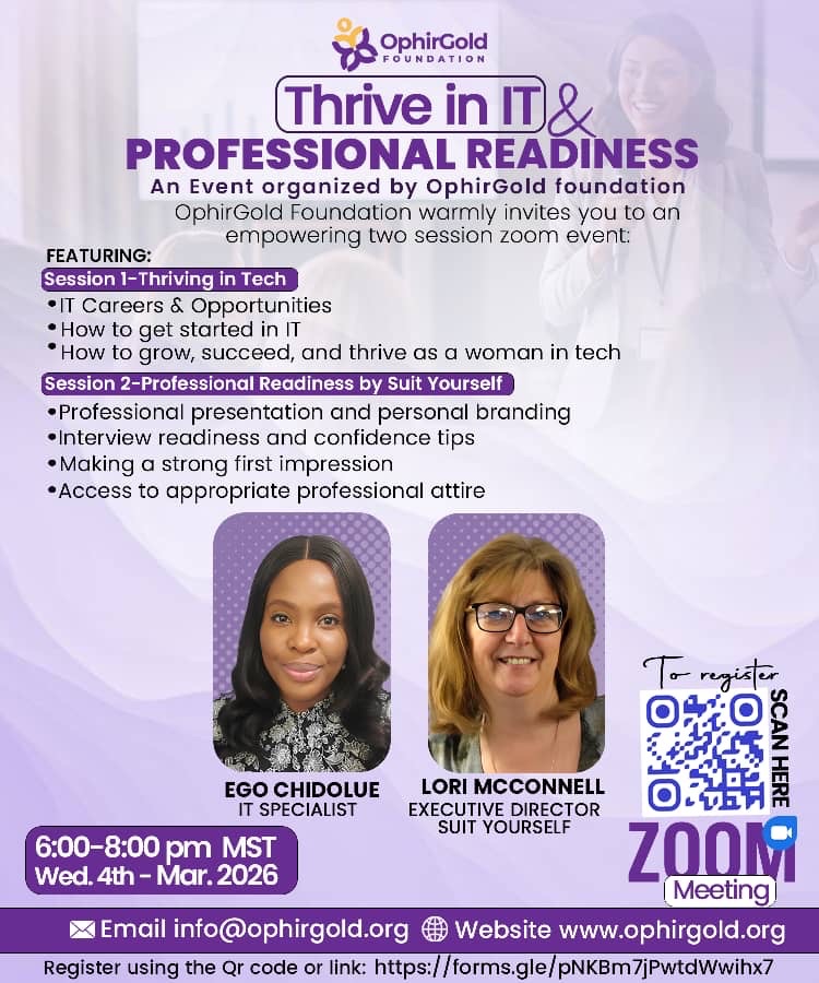 The OphirGold Foundation is excited to host Thrive in IT & Professional Readiness, a two-session virtual event designed to equip women with the tools, confidence, and knowledge to succeed in today’s professional world.